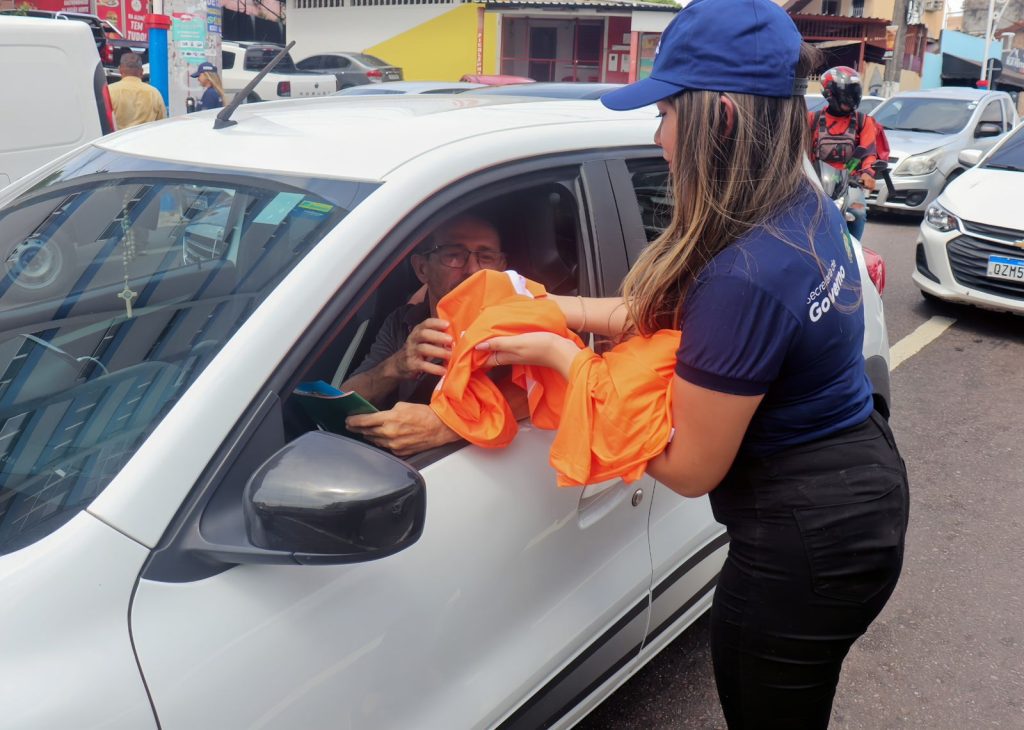 Dando continuidade na série de ações em torno da Semana Nacional de Trânsito (SNT), o Departamento Estadual de Trânsito do Amazonas (Detran-AM), que completa 53 anos de fundação nesta quinta-feira (25/09), promoveu, na avenida Djalma Batista, zona centro-sul de Manaus, uma ação de conscientização para condutores. Ao todo, 200 camisetas e 200 revistas educativas foram distribuídas aos motoristas e motociclistas que passaram pelo local.