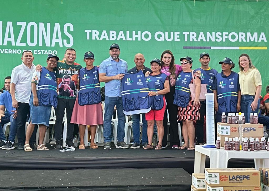 FOTOS: Mauro Neto/Secom e Lana Honorato/ADEm parceria com a Agência de Fomento do Amazonas (Afeam), a ADS fez o repasse de cheque do programa +Crédito Amazonas Feirantes, no valor de R$ 21 mil, e a doação de 60 kits feirantes, com coletes e bonés, para os trabalhadores da Feira de Produtos Regionais de Novo Airão.