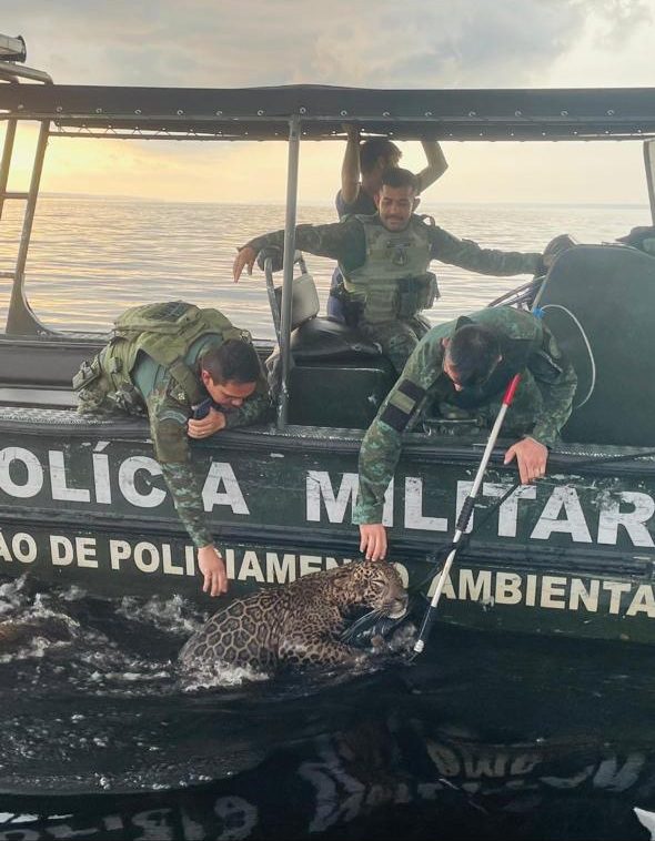 A Polícia Militar do Amazonas (PMAM), por meio do Batalhão de Polícia Ambiental (BPAmb), resgatou, na tarde de quarta-feira (1º/10), uma onça pintada, que apresentava sinais de ferimento e cansaço, enquanto tentava não se afogar, em uma área ribeirinha, no Rio Negro-Amazonas.